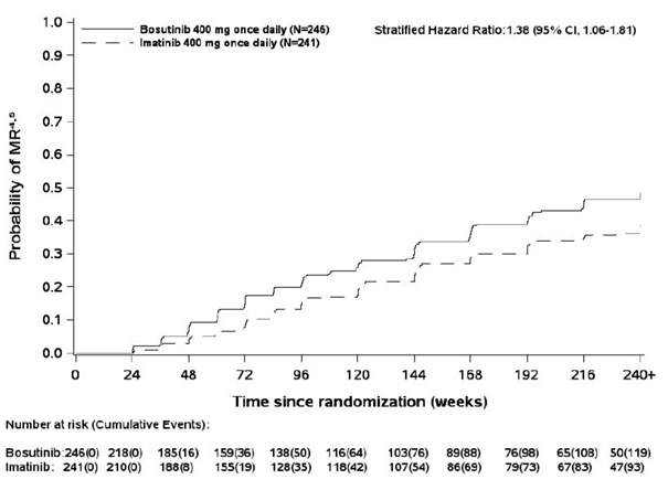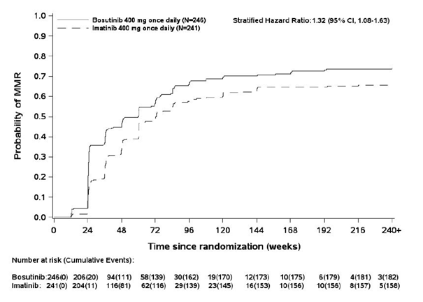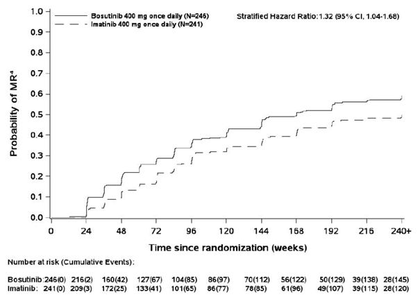 Au cours des essais cliniques menés sur les deux indications, le traitement par bosutinib a été poursuivi jusqu’à progression de la maladie ou intolérance du traitement.