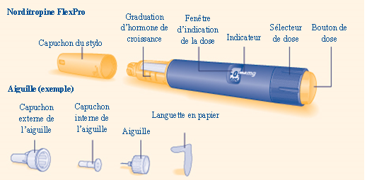 Votre stylo NORDITROPINE FLEXPRO est un stylo prérempli d’hormone de croissance. NORDITROPINE FLEXPRO contient 5 mg de solution d’hormone de croissance humaine et délivre des doses allant de 0,025 mg à 2,0 mg, par paliers de 0,025 mg. NORDITROPINE FLEXPRO est conçu pour être utilisé avec les aiguilles à usage unique NovoFine ou NovoTwist d’une longueur maximale de 8 mm.
