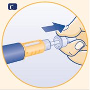 B Prenez une aiguille neuve à usage unique. Retirez la languette en papier et vissez l'aiguille de manière bien droite sur le stylo. Assurez-vous que l'aiguille soit solidement fixée.