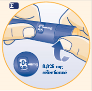 E Tournez le sélecteur de dose afin de sélectionner la dose minimale de 0,025 mg.