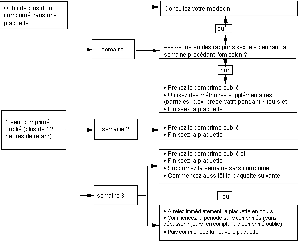 Le risque de grossesse est particulièrement important si vous oubliez de prendre des comprimés au début ou à la fin de la plaquette. Vous devez donc respecter les recommandations énoncées ci-après (reportez-vous au diagramme).