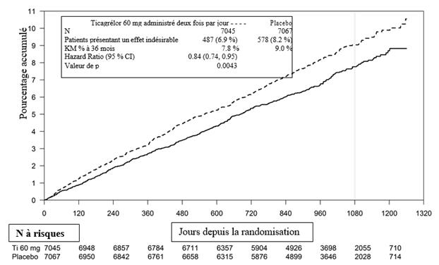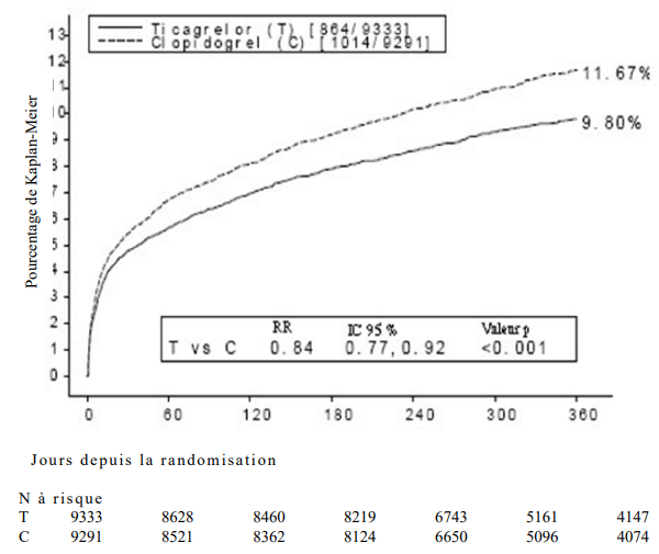Durant la sous étude Holter de PLATO, un plus grand nombre de patients présentait des pauses ventriculaires ≥3 secondes avec le ticagrélor qu’avec le clopidogrel pendant la phase aiguë du syndrome coronaire aigu. L’augmentation du nombre de pauses ventriculaires détectées dans la sous étude Holter avec le ticagrélor était plus importante chez les patients ayant une insuffisance cardiaque chronique (ICC) que dans la population générale de l’étude durant la phase aiguë du SCA, mais pas à 1 mois après le SCA avec le ticagrélor ou comparé au clopidogrel. Il n’y a pas eu de conséquences cliniques associées à ce trouble (incluant syncope ou la pose de pacemaker) dans cette population de patients (voir rubrique 5.1).