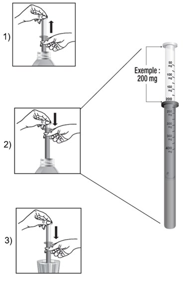 Le flacon de solution buvable est accompagné d’une seringue pour administration orale. Les traits de graduation indiquent les doses exprimées en milligrammes (une graduation tous les 25 mg, de 50 mg à 400 mg).