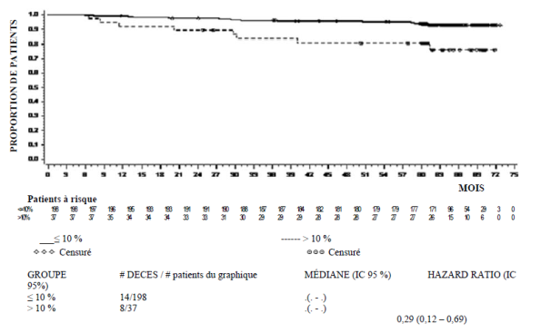 1 Vérifier si la cytopénie est imputable à la leucémie (ponction ou biopsie médullaire). 2 Si la cytopénie n'est pas imputable à la leucémie, arrêter le traitement jusqu'à ce que PNN ≥ 1,0 × 109/L et plaquettes ≥ 20 × 109/L et reprendre le traitement à la dose initiale d’origine. 3 En cas de récidive de la cytopénie, recommencer à l'étape 1 et reprendre le traitement à la dose réduite de 100 mg une fois par jour (second épisode) ou de 80 mg une fois par jour (troisième épisode). 4 Si la cytopénie est imputable à la leucémie, envisager une augmentation posologique à 180 mg une fois par jour. |