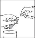 2. Retourner ensuite l’ampoule au‑dessus d’un verre en la tenant obliquement afin que la deuxième pointe ne soit pas au‑dessus du verre. Casser la deuxième pointe de la même façon pour permettre au liquide de s’écouler. |