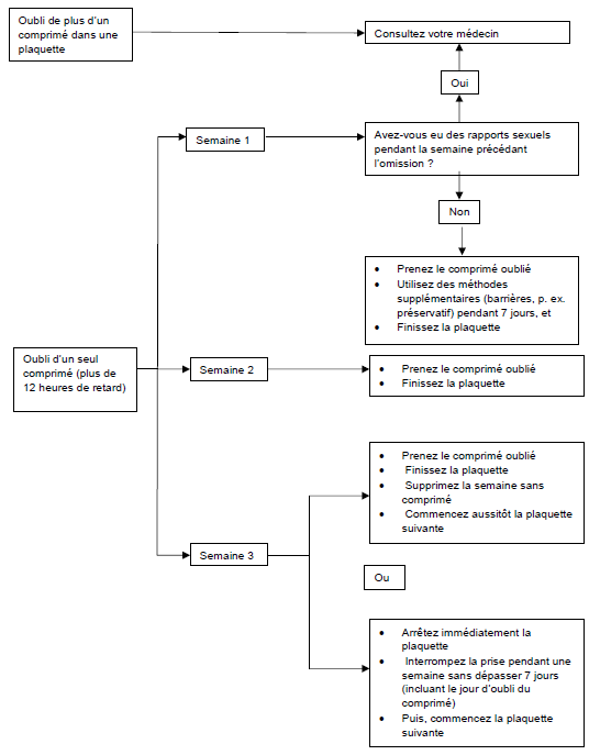 Il devra être recommandé aux femmes de prendre le dernier comprimé oublié dès que l’oubli est constaté, même si cela implique la prise de deux comprimés en même temps.