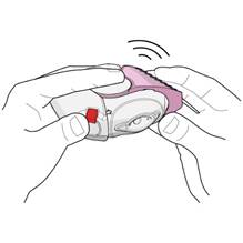 1. Le dispositif doit être ouvert en appuyant sur le bouton de sécurité rouge et être amorcé en faisant glisser le couvercle de l’embout buccal rose clair jusqu’à entendre un déclic.