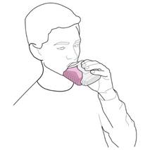 2. L’embout buccal doit être placé dans la bouche et les lèvres doivent être resserrées autour de lui. Il doit inspirer profondément par la bouche et aussi fort que cela est possible. Le patient doit ensuite retirer l’inhalateur de sa bouche et retenir sa respiration pendant 10 secondes ou aussi longtemps qu’il le peut sans être gêné(e).