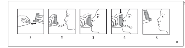 5. Retenir sa respiration aussi longtemps que possible et ensuite retirer l'inhalateur de la bouche et expirer lentement. Le patient ne doit pas expirer dans l'inhalateur.