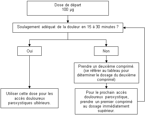 Pendant la phase de titration, les patients doivent être informés de la possibilité d’utiliser plusieurs comprimés de 100 µg et/ou de 200 µg comme dose unique. Le nombre de comprimés administrés pour le traitement d’un seul accès douloureux paroxystique ne doit pas être supérieur à quatre (4).