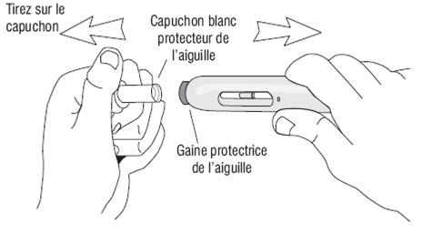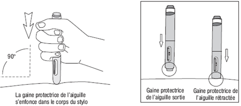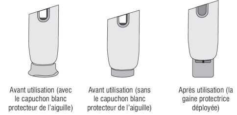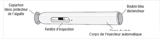 Comment utiliser l'injecteur automatique a) Lavez-vous soigneusement les mains. b) Trouvez un endroit confortable et bien éclairé et mettez tout ce dont vous avez besoin à portée de main (injecteur automatique, alcool ou des compresses stériles). c) Identifiez une zone d'application avec une couche suffisante de tissu adipeux, par exemple sur la partie supérieure du bras ou sur la cuisse. Ne pas injecter dans les zones où la peau est sensible, blessée, rouge ou dure. d) Nettoyez le site d'injection avec de l'alcool ou une compresse stérile neuve et laisser sécher votre peau. Ne touchez cette zone avant de faire l'injection. e) Sortez l'injecteur automatique de sa boîte. f) Prenez l'injecteur automatique dans une main et enlevez doucement le capuchon blanc protecteur de l'aiguille en tirant dessus avec l’autre main. Ne le tournez pas et ne remettez pas le capuchon blanc protecteur de l'aiguille, car ces manipulations pourraient endommager l'aiguille qui se trouve à l'intérieur de l'injecteur automatique Comment commencer l'injection: (1) Sans appuyer sur le bouton bleu déclencheur, placez l'extrémité ouverte de l'injecteur automatique sur le site d'injection avec un angle droit (90°) et poussez la gaine blanche protectrice de l'aiguille fermement sur la peau pour déverrouiller le système. L’injecteur automatique ne fonctionne que si la gaine protectrice de l’aiguille est complètement rétractée. Continuez à tenir l'injecteur automatique fermement sur la peau. (2) Appuyez et relâchez le bouton bleu déclencheur (un premier « clic » sonore se fait entendre). Cela déclenche l'injection. (3) Ne pas retirer l'injecteur automatique de la peau. (4) Attendez jusqu'à ce que vous entendiez un deuxième « clic ».La fenêtre d’inspection deviendra bleue, confirmant que l’injection est finie. (5) Levez l'injecteur automatique directement vers le haut. L'injection est terminée. Si la fenêtre d'inspection n'est pas bleue, n'essayez pas d'utiliser une seconde fois l'injecteur automatique. |