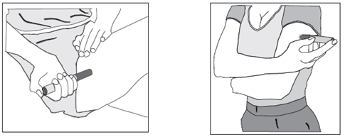 NE JAMAIS ESSAYER DE RE-UTILISER UN INJECTEUR AUTOMATIQUE. Si vous pensez que vous n'avez pas reçu la totalité de la dose, ne répétez pas l'injection en utilisant un nouvel injecteur automatique. (7) Si vous remarquez une goutte de sang au site d'injection, essuyez la avec du coton ou un mouchoir. Ne frottez pas le site d'injection. Si besoin, vous pouvez couvrir le site d'injection avec un bandage. |