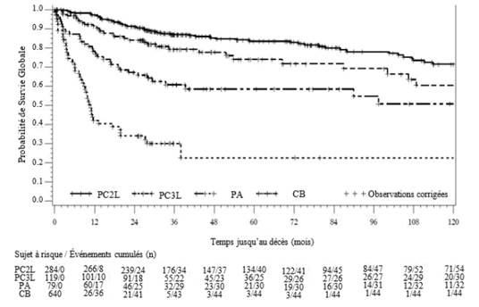 Abréviations : CB = crise blastique ; LMC = leucémie myéloïde chronique ; ND = nouvellement diagnostiquée ; PA = phase accélérée ; PC = phase chronique ; Ph+ = chromosome Philadelphie positif ; R/I = résistance ou intolérance ; SC = surface corporelle.