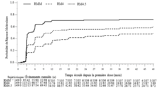 Chez les patients adultes atteints de LMC en PC nouvellement diagnostiquée, des augmentations de dose par paliers de 100 mg jusqu’à 600 mg maximum une fois par jour peuvent être instaurées si le patient ne présente pas un taux du transcrit breakpoint cluster region-Abelson (BCR-ABL) ≤ 10 % au mois 3, si le patient ne présente pas d’effet indésirable de grade 3 ou 4 au moment de l’augmentation, et que toutes les toxicités non hématologiques de grade 2 ont été résolues et sont revenues au moins au grade 1.