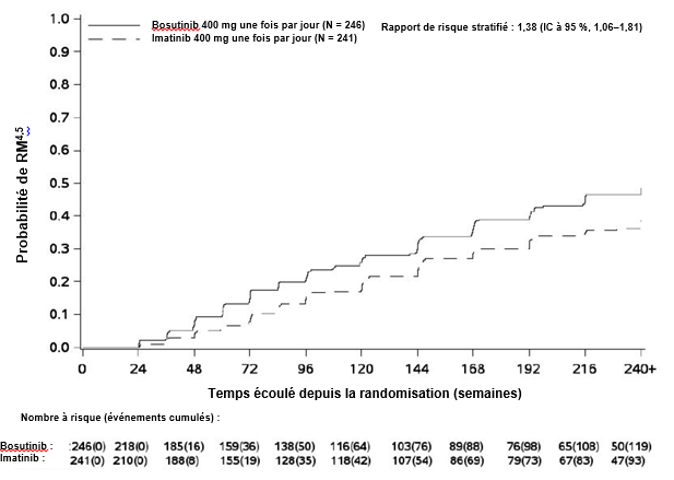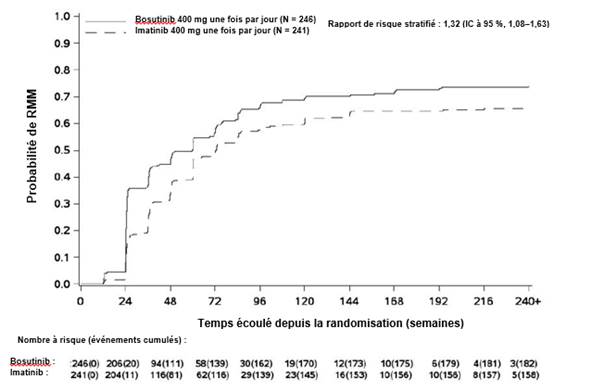 Au cours des essais cliniques menés sur les deux indications, le traitement par bosutinib a été poursuivi jusqu’à progression de la maladie ou intolérance du traitement.