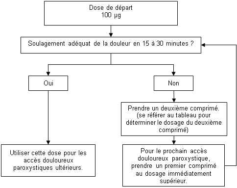 Pendant la phase de titration, les patients doivent être informés de la possibilité d’utiliser plusieurs comprimés de 100 µg et/ou de 200 µg comme dose unique. Le nombre de comprimés administrés pour le traitement d’un seul accès douloureux paroxystique ne doit pas être supérieur à quatre (4).