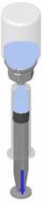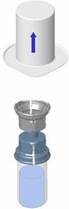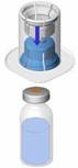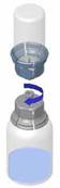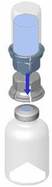 Retourner l’ensemble flacon de solvant-dispositif et l’enclencher sur le flacon de poudre par la partie transparente du dispositif. Le solvant est transféré automatiquement dans le flacon de poudre. Maintenir l’ensemble et agiter doucement, d’un mouvement circulaire, pour dissoudre totalement le produit. |