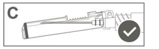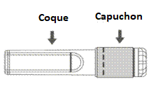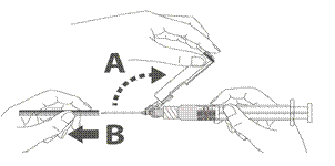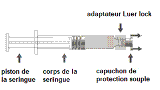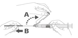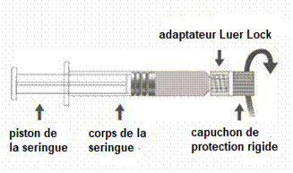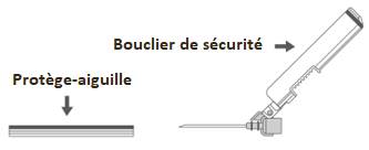 Instructions d’utilisation de l'aiguille sécurisée avec la seringue préremplie Luer Lock : Figure A : Aiguille sécurisée (à l’intérieur de la coque) Figure B : Composants de l’aiguille sécurisée (préparée pour l’utilisation) Étape 1 : Pour fixer l’aiguille à la seringue, retirer le capuchon pour exposer l’embase de l'aiguille et visser doucement l’aiguille à l’adaptateur Luer lock jusqu’à sentir une légère résistance. Étape 2 : Retirer la coque de l’aiguille sécurisée en tirant tout droit. L’aiguille est recouverte par le bouclier de sécurité et le protège-aiguille. Étape 3 : A : soulever le bouclier de sécurité en l’écartant de l’aiguille et en le poussant vers le corps de la seringue selon l’angle indiqué. B : Retirez le protège-aiguille en tirant tout droit. Étape 4 : Une fois l’injection terminée, verrouiller (activer) avec une seule main le bouclier de sécurité à l'aide de l'une des trois (3) techniques illustrées : activation à l’aide d’une surface, du pouce ou de l’index. Remarque : L'activation est vérifiée par un « clic » sonore et/ou tactile. Étape 5: Inspecter visuellement l’activation du bouclier de sécurité. Le bouclier de sécurité doit être entièrement verrouillé (activé), comme indiqué sur l’image C. L’image D indique que le bouclier de sécurité n'est PAS complètement verrouillé (non activé) Attention : Ne pas essayer de déverrouiller (désactiver) le dispositif de sécurité en forçant l'aiguille à sortir du bouclier de sécurité. Tout médicament non utilisé ou déchet doit être éliminé conformément à la réglementation en vigueur.>