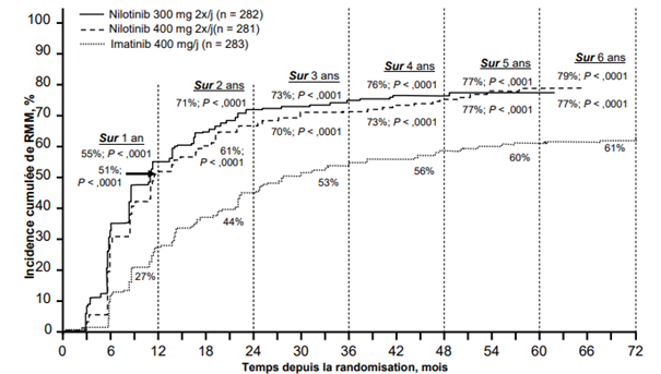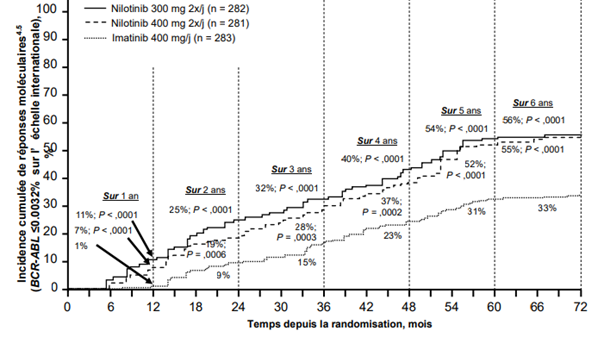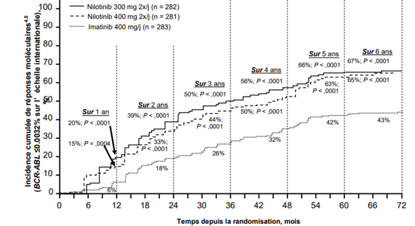 Patients adultes atteints de LMC en phase chronique nouvellement diagnostiquée à la posologie de 300 mg deux fois par jour et LMC en phase chronique en cas de résistance ou intolérance à l’imatinib à la posologie de 400 mg deux fois par jour |