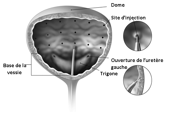 Lorsqu’il est injecté dans la paroi de la vessie, BOTOX agit sur le muscle de la vessie pour réduire les fuites urinaires (incontinence urinaire) et contrôler les situations suivantes :