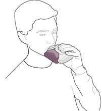 2. Le patient doit d’abord expirer. L’embout buccal doit être placé dans la bouche et les lèvres doivent être resserrées autour de lui. Il doit inspirer profondément par la bouche et aussi fort que cela est possible. Le patient doit ensuite retirer l’inhalateur de sa bouche et retenir sa respiration pendant 10 secondes ou aussi longtemps qu’il le peut sans être gêné(e).