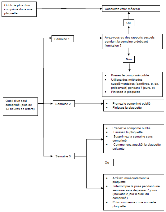 Il devra être recommandé aux femmes de prendre le dernier comprimé oublié dès que l’oubli est constaté, même si cela implique la prise de deux comprimés en même temps.