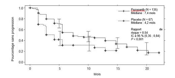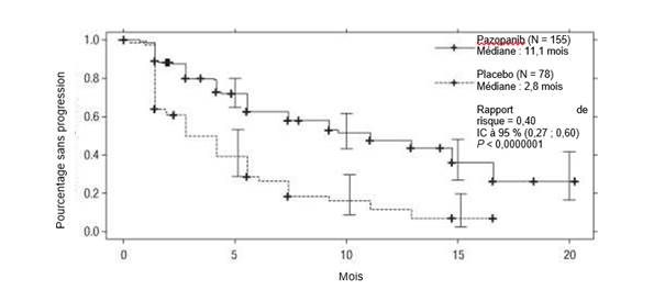 Des cas de dysfonctionnement cardiaque tels qu’une insuffisance cardiaque congestive et une diminution de la FEVG sont survenus dans les études cliniques réalisées avec le pazopanib (voir rubrique 4.8). Dans une étude randomisée comparant le pazopanib et le sunitinib chez des sujets ayant un RCC (VEG108844), la FEVG a été mesurée à l’inclusion et lors du suivi. Des cas de dysfonctionnement myocardique sont survenus chez 13 % (47/362) des sujets du bras pazopanib et chez 11 % (42/369) des sujets du bras sunitinib. Une insuffisance cardiaque congestive a été observée chez 0,5 % des sujets de chaque bras de traitement. Une insuffisance cardiaque congestive a été rapportée chez 3 des 240 sujets (1 %) dans l’étude STS de phase III VEG110727. Des diminutions de la FEVG ont été détectées chez 11 % (15/140) des sujets contrôlés post-inclusion puis au cours du suivi dans le bras pazopanib versus 3 % (1/39) dans le bras placebo.