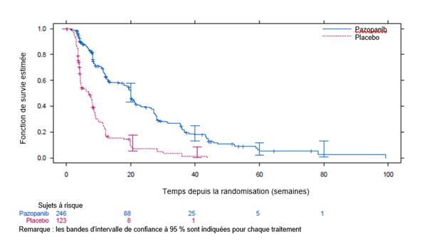 Les données concernant l’utilisation du pazopanib chez les patients âgés de 65 ans et plus sont limitées. Dans les études portant sur le pazopanib dans le RCC, globalement aucune différence cliniquement significative n’a été observée concernant la sécurité du pazopanib entre les sujets âgés de plus de 65 ans et les sujets plus jeunes. L’expérience clinique n’a pas mis en évidence de différence de réponses entre les personnes âgées et les patients plus jeunes ; cependant, une plus grande sensibilité chez certains patients âgés ne peut être exclue.