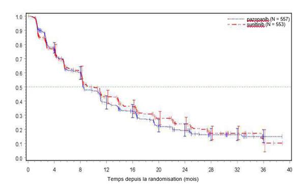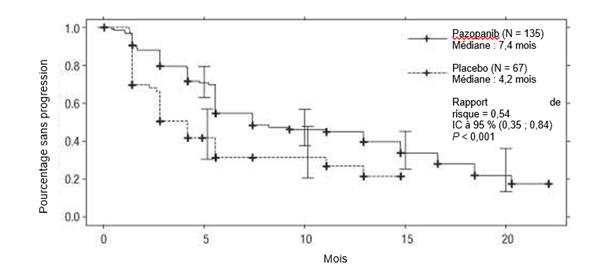 Des cas de dysfonctionnement cardiaque tels qu’une insuffisance cardiaque congestive et une diminution de la FEVG sont survenus dans les études cliniques réalisées avec le pazopanib (voir rubrique 4.8). Dans une étude randomisée comparant le pazopanib et le sunitinib chez des sujets ayant un RCC (VEG108844), la FEVG a été mesurée à l’inclusion et lors du suivi. Des cas de dysfonctionnement myocardique sont survenus chez 13 % (47/362) des sujets du bras pazopanib et chez 11 % (42/369) des sujets du bras sunitinib. Une insuffisance cardiaque congestive a été observée chez 0,5 % des sujets de chaque bras de traitement. Une insuffisance cardiaque congestive a été rapportée chez 3 des 240 sujets (1 %) dans l’étude STS de phase III VEG110727. Des diminutions de la FEVG ont été détectées chez 11 % (15/140) des sujets contrôlés post-inclusion puis au cours du suivi dans le bras pazopanib versus 3 % (1/39) dans le bras placebo.