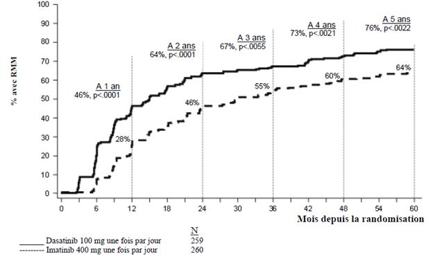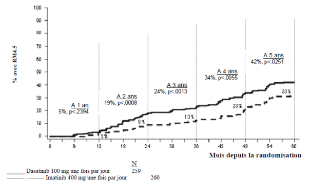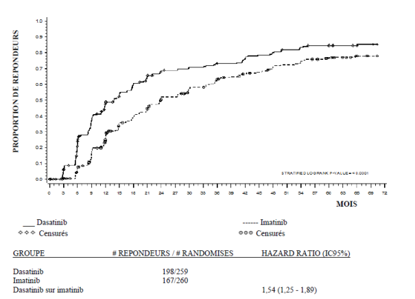 Dans les études cliniques, le traitement par dasatinib chez les patients adultes atteints de LMC Ph+ PC, de LMC en phase accélérée, en phase blastique myéloïde ou blastique lymphoïde (phase avancée) ou de LAL Ph+ et chez les patients pédiatriques atteints de LMC Ph+ PC était poursuivi jusqu'à progression de la maladie ou intolérance. L'effet de l'arrêt du traitement sur l’issue de la maladie à long terme après obtention d'une réponse moléculaire ou cytogénétique [incluant une réponse cytogénétique complète (RCyC), une réponse moléculaire majeure (RMM) et une RM4.5] n'a pas été étudié.