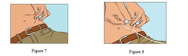 · Pincez la peau entre le pouce et l’index autour du site d’injection (Figure 7) et retirez délicatement la coiffe de l'aiguille et insérez l'aiguille dans la peau (Figure 8). L’angle de l’aiguille dépendra du type de set de perfusion utilisé.