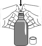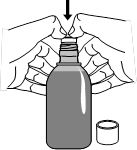 1. Secouez énergiquement le flacon de médicament pendant au moins 10 secondes. 2. Retirez le bouchon inviolable en appuyant fortement dessus et en le tournant dans le sens contraire des aiguilles d’une montre (comme indiqué sur le dessus du bouchon). Note : conservez soigneusement le bouchon afin de refermer le flacon après chaque usage. |