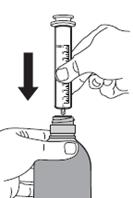 · Vérifiez que le piston est complètement enfoncé dans le corps de la seringue pour administration orale. · Maintenez le flacon en position droite et insérez fortement la seringue pour administration orale dans l’adaptateur en plastique. |