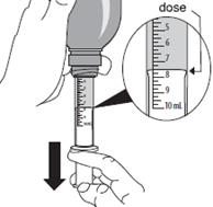 · Prélevez la dose prescrite : tirez lentement le piston vers le bas jusqu’à ce que le bord supérieur du piston soit au niveau du marqueur indiquant la dose prescrite sur le corps de la seringue pour administration orale. Note : Si la dose prescrite est supérieure à 10 ml, retirez la dose prescrite en deux fois. Premièrement remplissez la seringue jusqu’à la marque 10 ml et prenez les 10 ml. Ensuite, vous devrez recharger la seringue afin d’arriver à la quantité restante. Demandez conseils à votre pharmacien si vous avez des doutes.