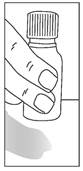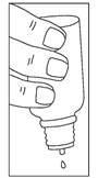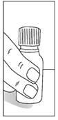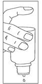 1 - Retirez le bouchon. Ne pas enlever la partie en plastique, insérée dans le flacon, qui sert de compte-gouttes. Retournez le flacon à l’envers. Pour délivrer les gouttes, tenez le flacon bien verticalement, compte-gouttes vers le bas :