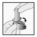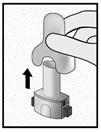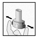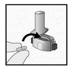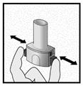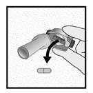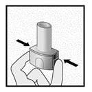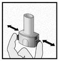 Etape 2a: Percer la gélule une seule fois Tenir l’inhalateur en position verticale. Percer la gélule en appuyant fermement sur les deux boutons latéraux en même temps Un bruit doit être entendu lorsque la gélule est percée. Percer la gélule une seule fois.