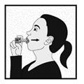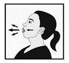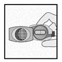 Etape 3b: Inhaler le médicament profondément Tenir l’inhalateur comme le montre l’illustration. Placer l’embout buccal dans la bouche et serrer fermement les lèvres sur l’embout. Ne pas appuyer sur les boutons latéraux. |