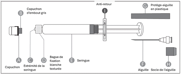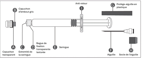 Étape 2 : D'une main, tenez fermement la seringue (E) par la bague de fixation transparente texturée (D). De l'autre main, insérez cette aiguille (F) et tournez-la dans le sens des aiguilles d'une montre jusqu'à sentir une légère résistance. Une fois l'aiguille verrouillée, retirez le protège-aiguille en plastique (G). La seringue est alors prête à l'emploi. |