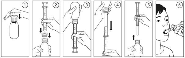 5. Verser doucement le contenu de la seringue dans la bouche en appuyant dessus et avaler le médicament (6).