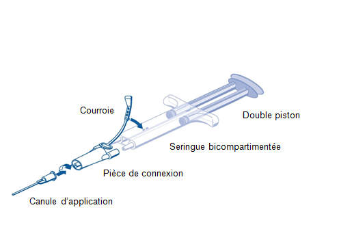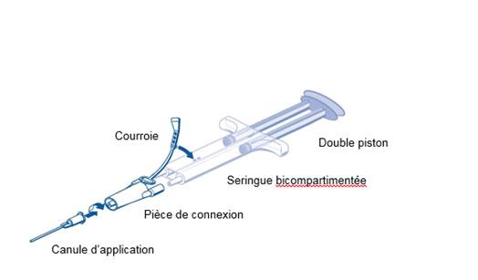 > 1 seringue (polypropylène) à double compartiment de 1 * 2 ml (1 ml + 1 ml) fermée par un capuchons avec un dispositif constitué de 2 pièces de raccordement et de 4 canules