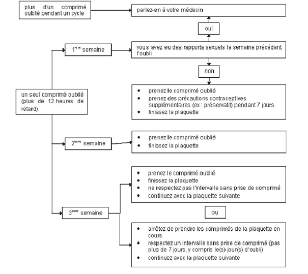 Il devra être recommandé aux femmes de prendre le dernier comprimé oublié dès que l’oubli est constaté, même si cela implique la prise de deux comprimés en même temps.