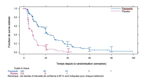 Les données concernant l’utilisation du pazopanib chez les patients âgés de 65 ans et plus sont limitées. Dans les études portant sur le pazopanib dans le RCC, globalement aucune différence cliniquement significative n’a été observée concernant la sécurité du pazopanib entre les sujets âgés de plus de 65 ans et les sujets plus jeunes. L’expérience clinique n’a pas mis en évidence de différence de réponses entre les personnes âgées et les patients plus jeunes ; cependant, une plus grande sensibilité chez certains patients âgés ne peut être exclue.