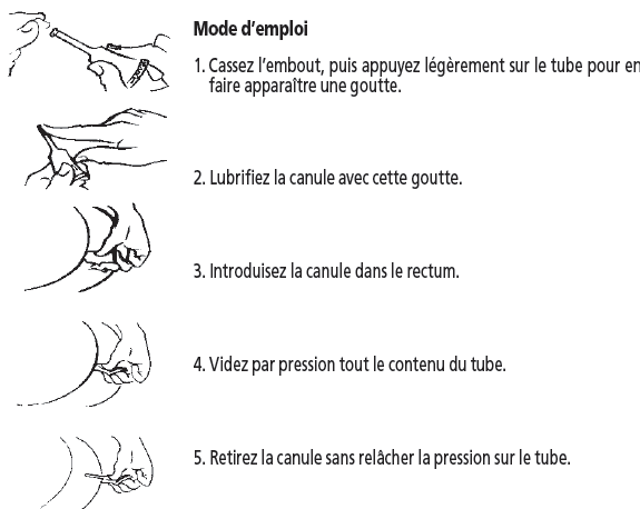 Introduire toute la longueur de la canule dans le rectum et vider par pression tout le contenu du tube, retirer la canule sans relâcher la pression sur le tube.