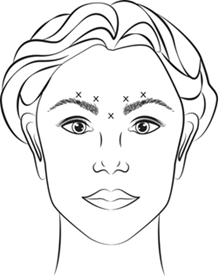 Les lignes horizontales de traitement, listées ci-dessous, doivent être localisées en palpant légèrement le front au repos et lors de l’élévation maximale des sourcils :