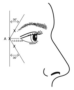 Les injections doivent être administrées avec le biseau de l’aiguille vers le haut et orientées à l’opposé de l’œil. La première injection (A) doit être effectuée à environ 1,5 à 2,0 cm de façon temporale au canthus latéral et juste temporale à l’orbite. Si les rides de la région de la patte d’oie se situent au-dessus et en-dessous du canthus latéral, injecter tel que schématisé dans la figure 2. Sinon, si les rides de la région de la patte d’oie se situent principalement sous le canthus latéral, injecter tel que schématisé dans la figure 3.