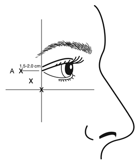 · Sur la ligne inférieure de traitement, au niveau de la ligne médiane du visage et à 0,5 - 1,5 cm du milieu de la ligne de fusion temporale (crête temporale) repérée par palpation; recommencez pour l’autre côté.