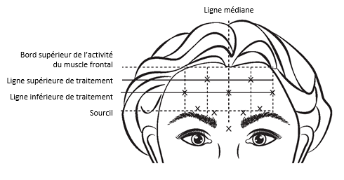 Pour un traitement simultané des rides glabellaires et des rides de la patte d’oie, la dose totale est de 64 Unités, réparties en 20 Unités pour les rides du front, 20 Unités pour les rides glabellaires (voir Instructions d’administration pour les rides glabellaires, et figure 1), et 24 Unités pour les rides de la patte d’oie (voir Instructions d’administration pour les rides de la patte d’oie, et figures 2 et 3).
