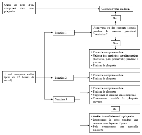 Il sera recommandé aux femmes de prendre le dernier comprimé oublié dès que cet oubli est constaté, même si deux comprimés doivent être pris en même temps.