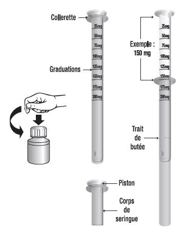Ce médicament s’administre, par voie orale avec une seringue pour administration orale graduée en mg, avec mention de 25 mg, 50 mg, 75 mg, 100 mg, 125 mg, 150 mg, 175 mg et 200 mg.