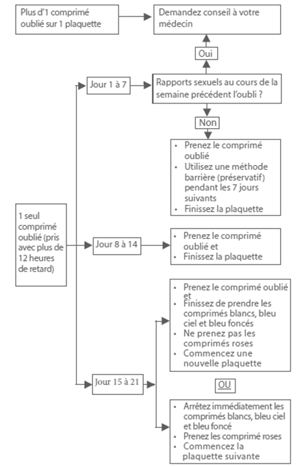 La femme doit prendre le dernier comprimé oublié dès qu'elle s’en souvient, même si cela signifie de prendre deux comprimés en même temps. Elle continue ensuite à prendre les comprimés à son heure habituelle. Pour autant que la femme a pris ses comprimés correctement au cours des 7 jours précédant le premier comprimé oublié, il n'est pas nécessaire d’utiliser de précautions contraceptives supplémentaires. Toutefois, si elle a oublié plus d’un comprimé, il sera conseillé à la femme d’utiliser des précautions supplémentaires pendant 7 jours.